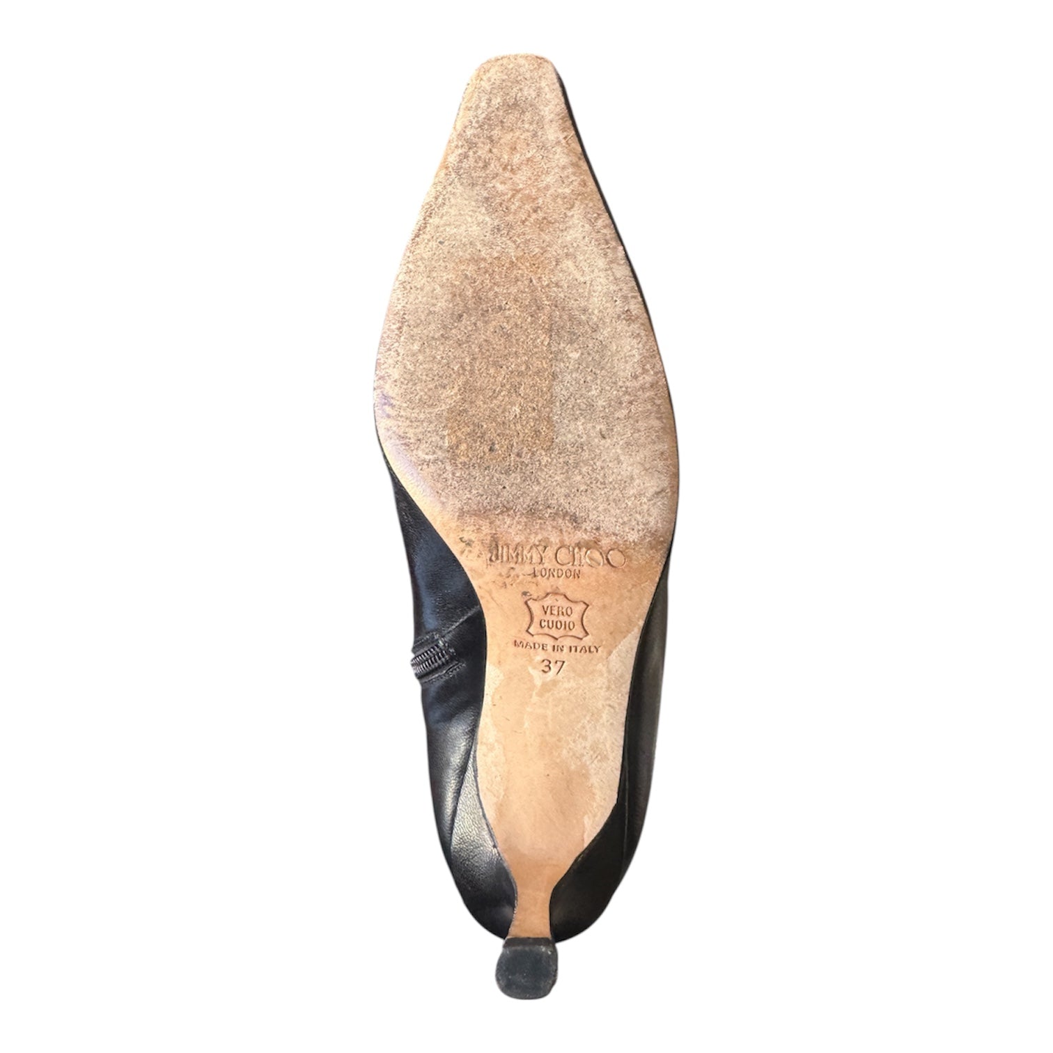 These Jimmy Choo black mid-calf leather heeled boots, made in Italy, embody timeless sophistication. Crafted with fine leather in a sleek silhouette, they offer elegant style and comfortable wear in size 37. Perfect for elevating any outfit with effortless grace.
