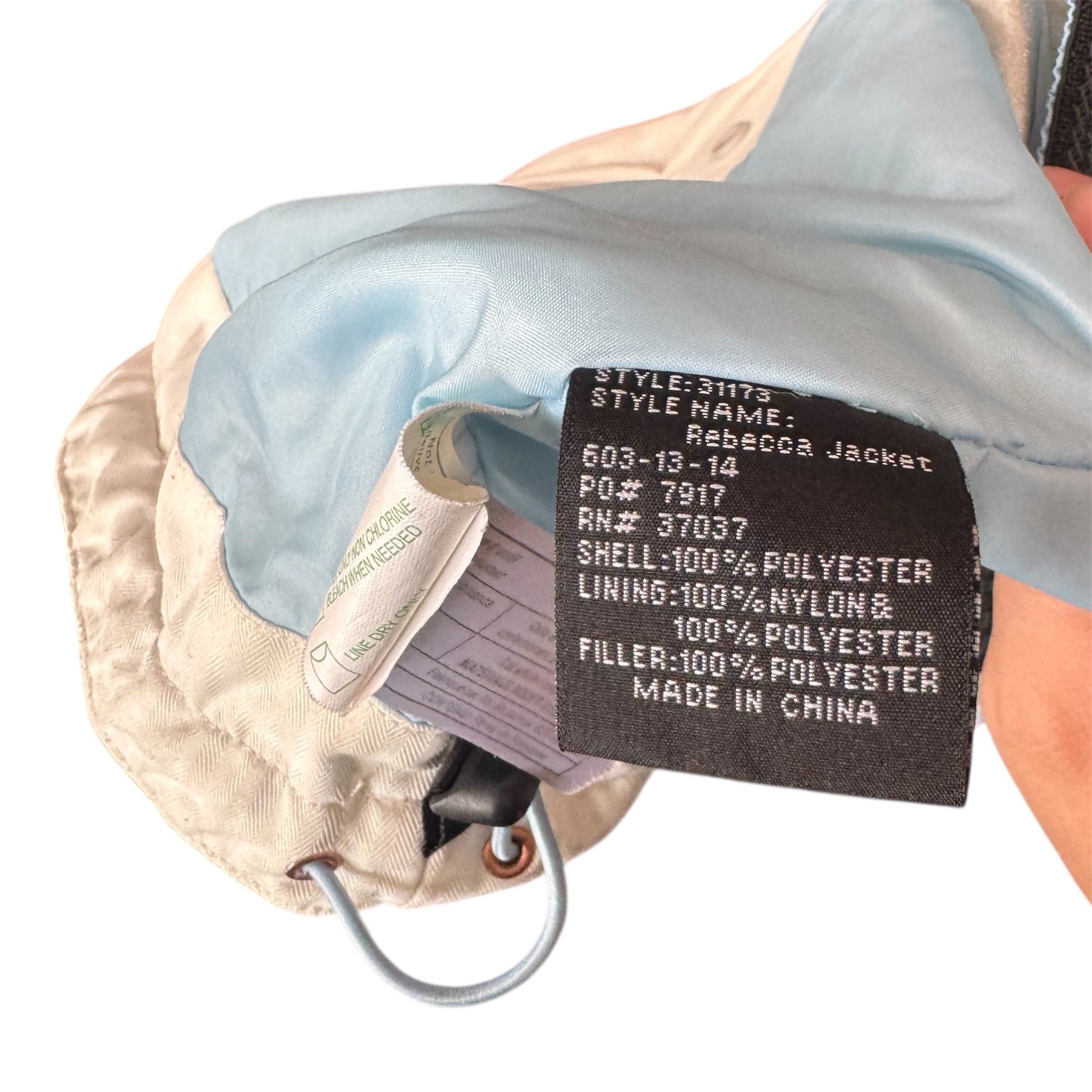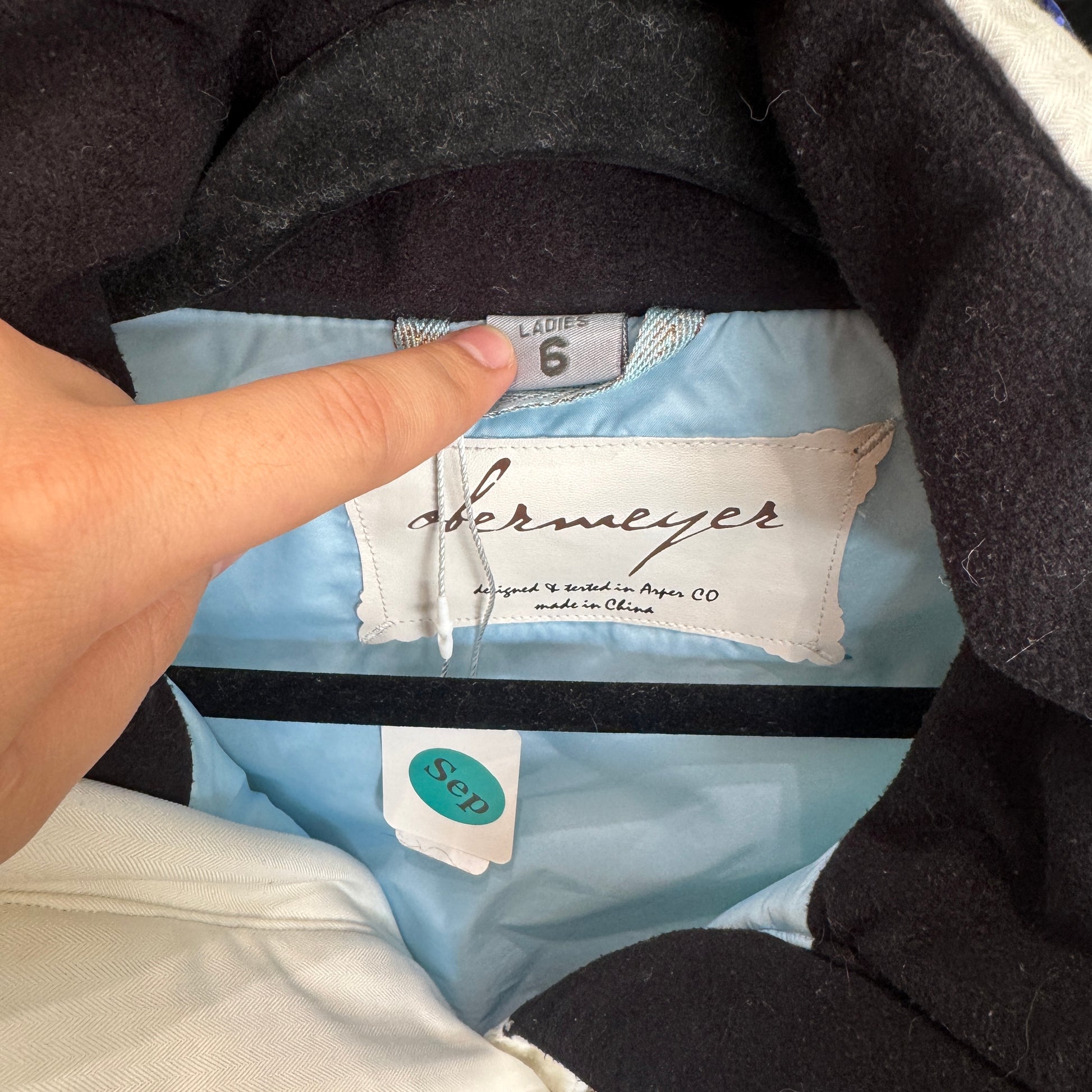 This Obermeyer Rebecca Jacket in white with multicolor stripes, size 6, offers a refined blend of style and comfort. In good overall condition with minimal pilling on the back, it maintains its polished appearance while adding a vibrant touch to your wardrobe. Perfect for those seeking both elegance and subtle color accents in a versatile outerwear piece.