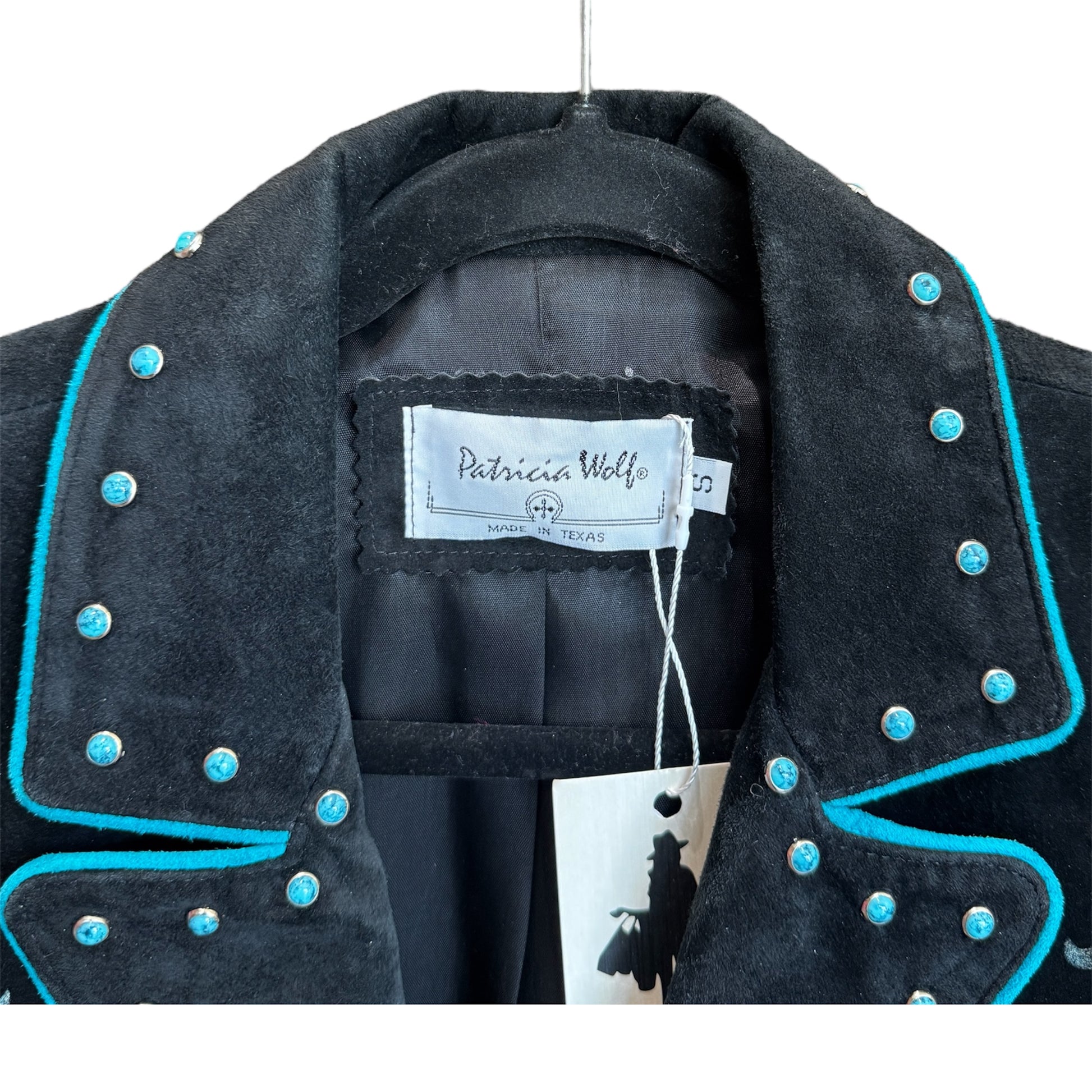 Crafted in Texas, this Patricia Wolf jacket features genuine suede leather combining classic black and blue tones. Designed in a western style and sized small, it offers an authentic vintage appeal. Ideal for collectors or enthusiasts seeking quality American-made western wear with timeless character.