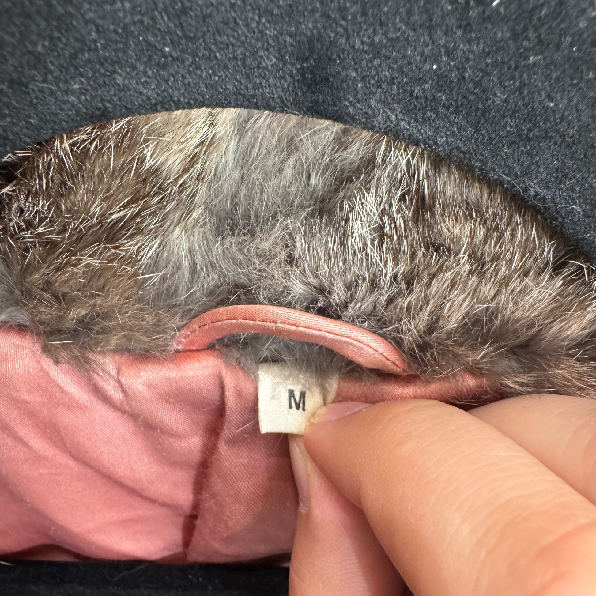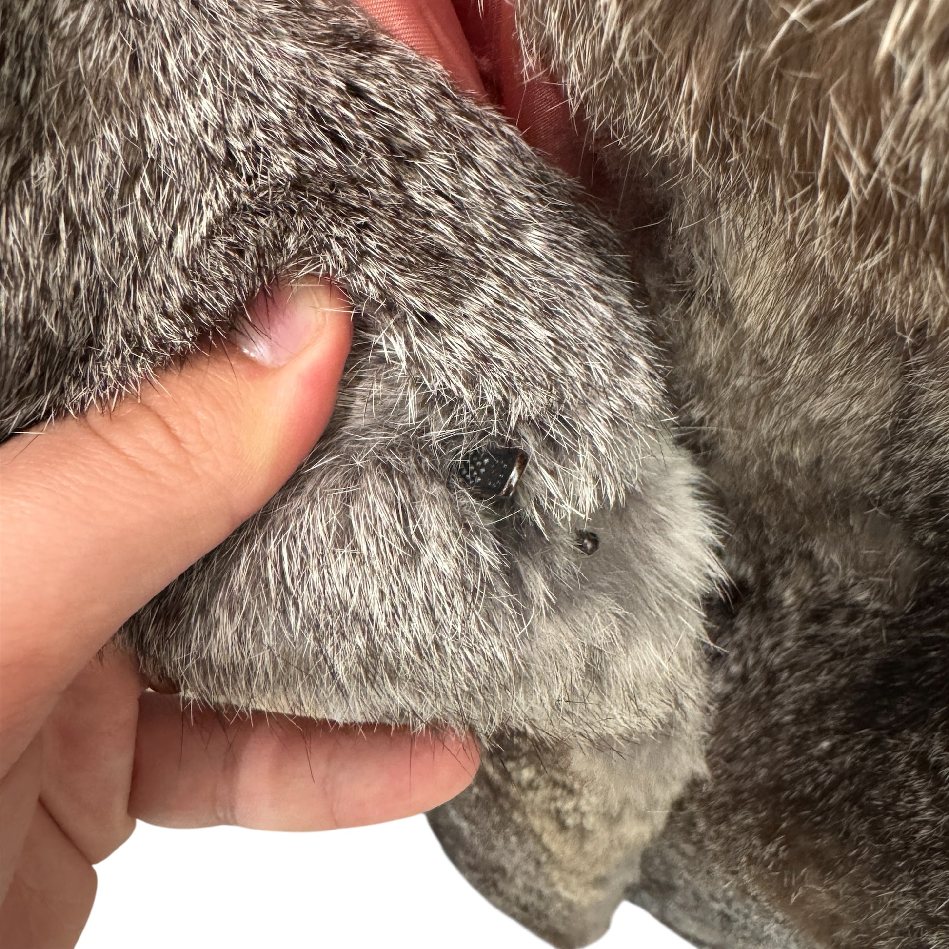 This elegant rabbit fur jacket, sized medium, showcases a timeless vintage style likely crafted with custom attention. The soft gray fur offers a refined texture and warmth, elevating any ensemble with understated luxury. Ideal for those seeking a sophisticated blend of classic charm and cozy comfort.