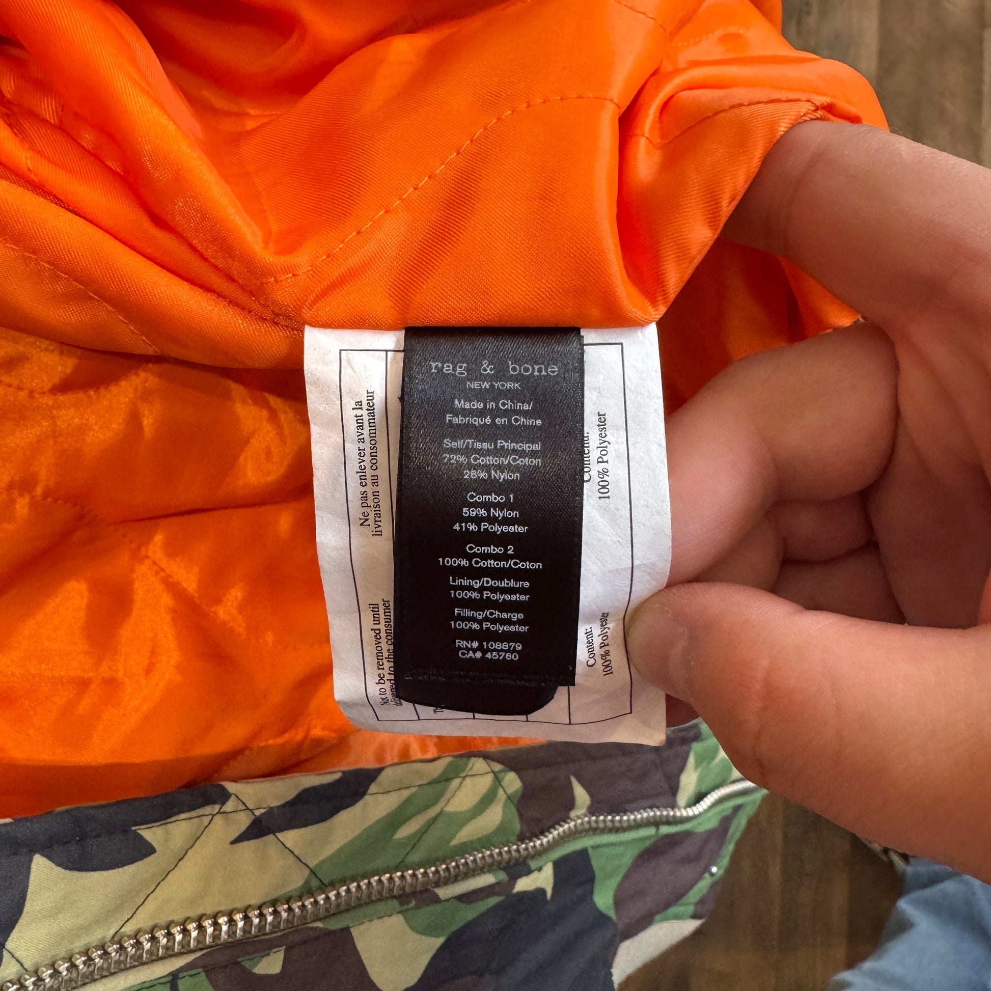 Elevate your wardrobe with this Rag & Bone Camo Bomber Jacket in size XXS. Crafted with a refined camo pattern, it combines urban edge with timeless sophistication. In excellent condition, this jacket offers a sleek, tailored fit perfect for layering, bringing both style and versatility to your collection.